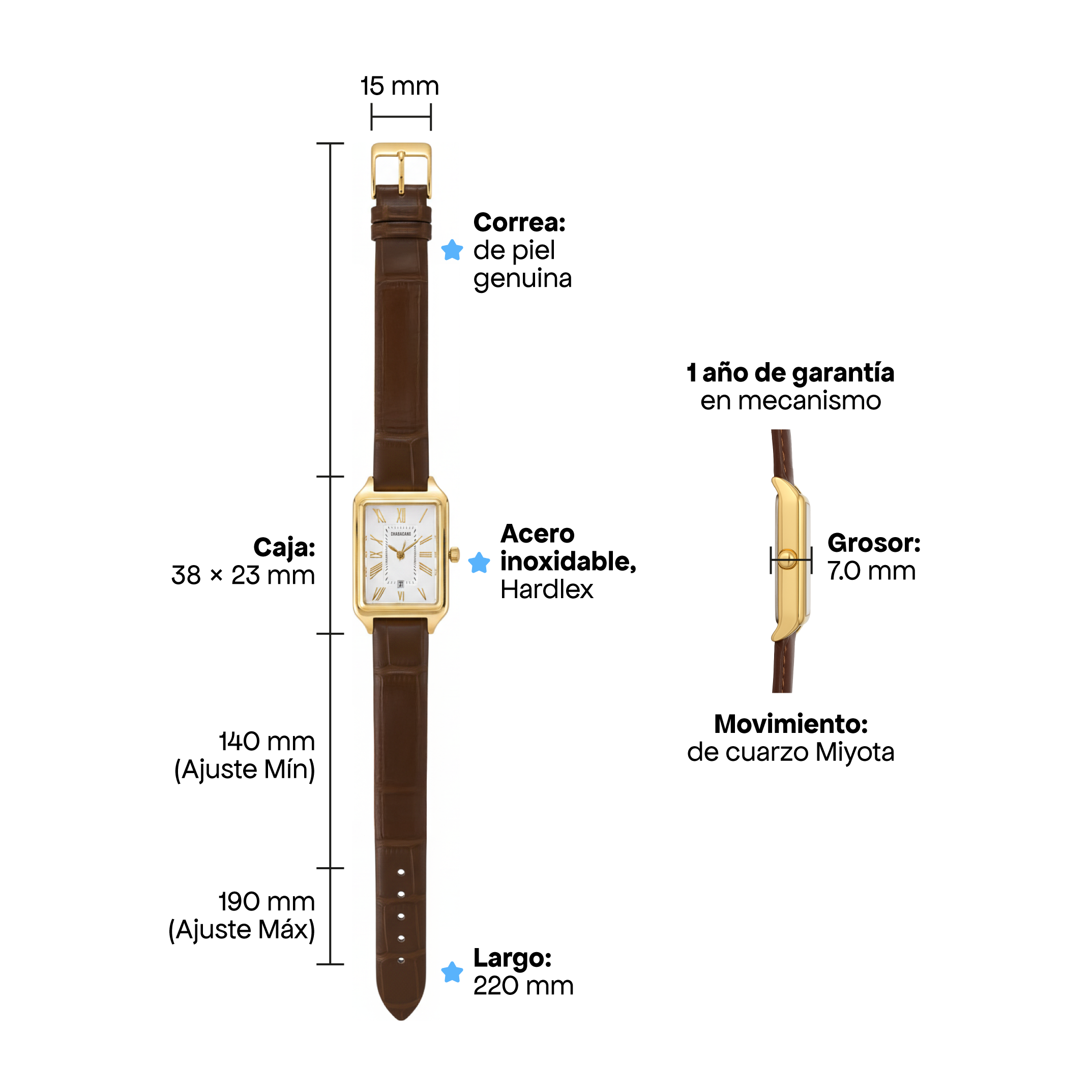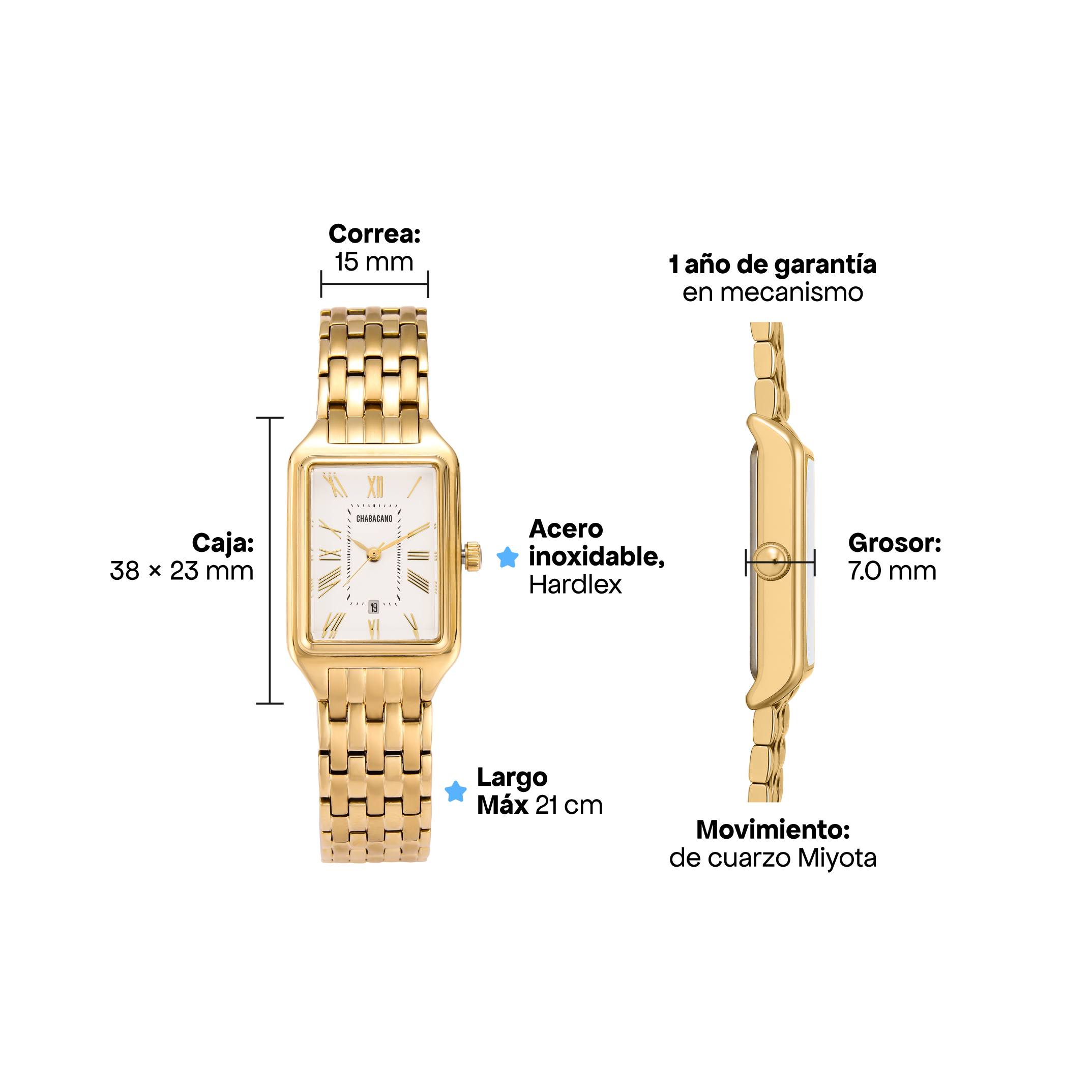 Nuestras piezas están hechas en acero inoxidable y bañadas en oro laminado, pensadas para usarse todos los días. No importa si te mojas, si sales de fiesta o si las llevas a diario: siguen brillando igual. Y para tu tranquilidad, todas tienen 1 año de garantía en color, excepto nuestros relojes.